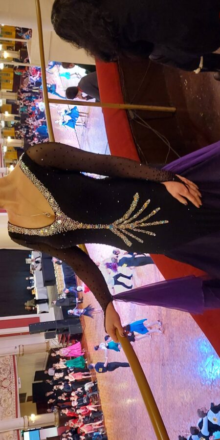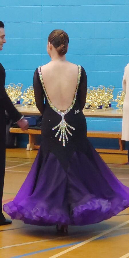 Stunning ombré black to purple ballroom dress with attached handkerchief floats and a low back. Stands out beautifully on the floor and moves well.