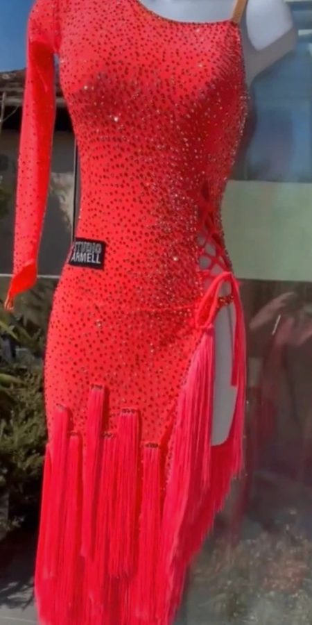 Ex-sponsor Studio Armell Latin Dress. Covered in rhinestones and thick tassel fringing.