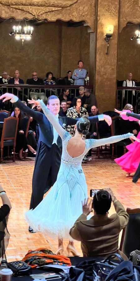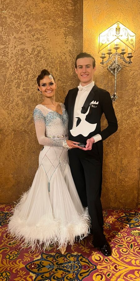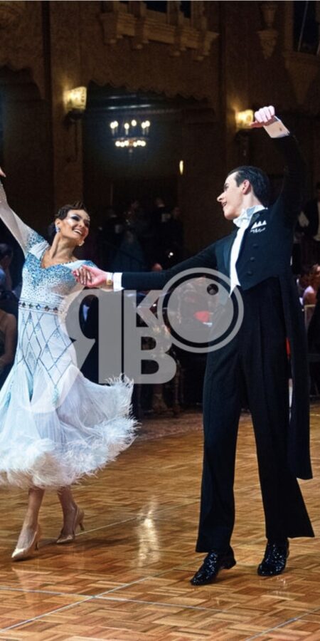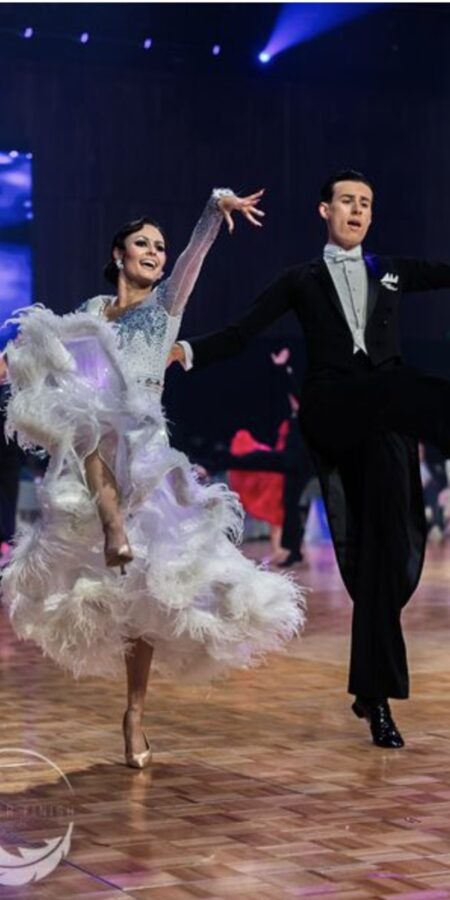 Beautiful white Dream Designs Ballgown. Incredibly stretchy, lightweight and comfortably. Has been crafted with a bodysuit to avoid movement. Heavily stoned with light blue Swarovski crystals and ostrich feathers.