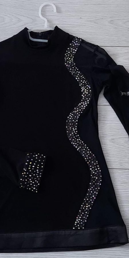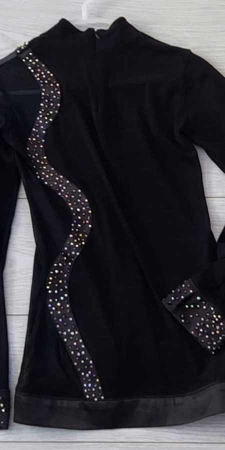 Black mesh design latin shirt with jet black preciosa crystals.