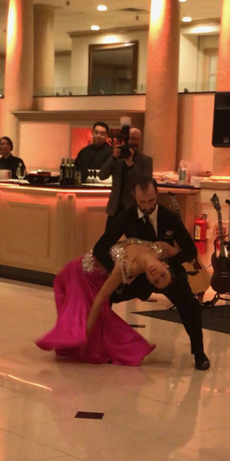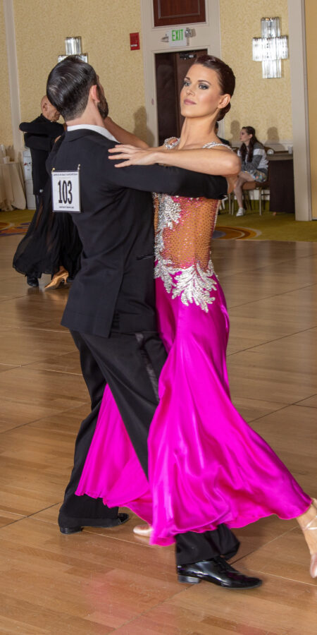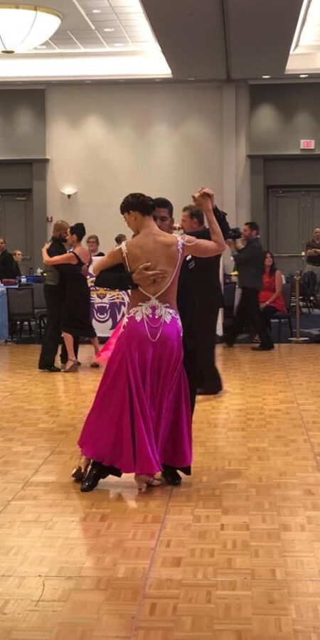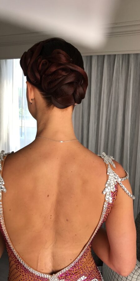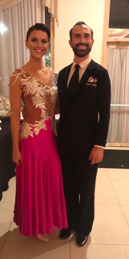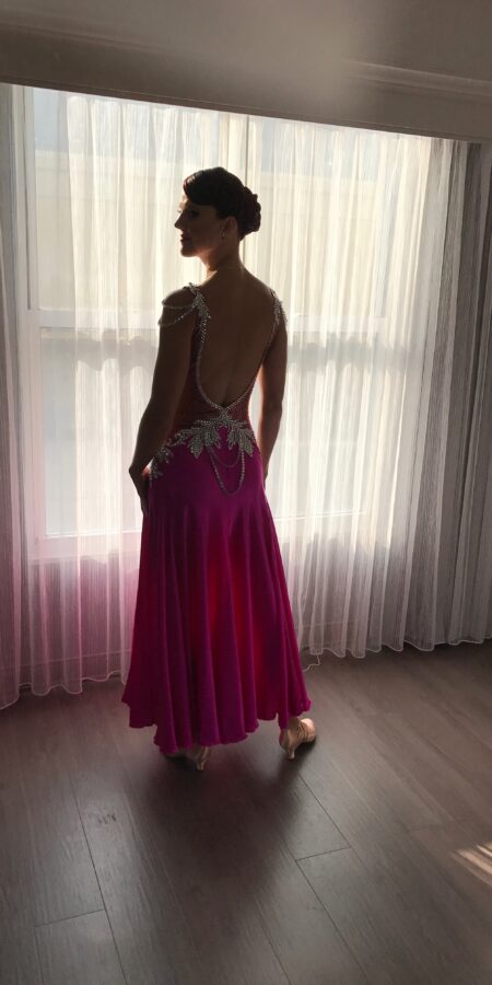 Original price was $2800. I have performed in this dress only 3 times and never worn it after that again. I have suffered an injury – torn hamstring, which prevented me from dancing. The dress is in an excellent condition – like new. Was custom made by a professional company from Connecticut for Arthur Murray dance studio and sold brand new to me. It fits like a glove and is suitable for a slim athletic body type. I am pretty muscular with strong shoulders and this dress felt like a glove and made me look very elegant and professional. It will upgrade your look and performance for sure. It is a high quality piece – well made with sturdy beadwork that doesn’t come off.