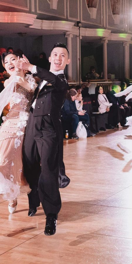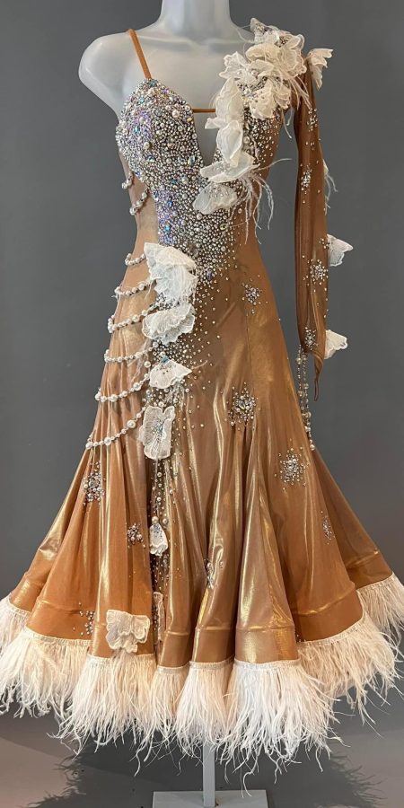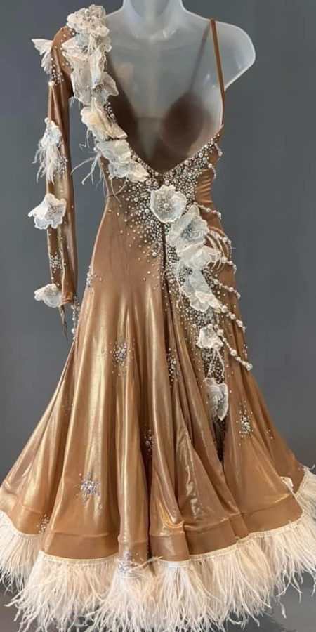 Turn heads on the dance floor in this luxurious, one-of-a-kind ballroom gown! Crafted from an iridescent metallic gold stretch mesh, the dress shimmers with movement and features exquisite crystal work throughout the bodice—using Swarovski-equivalent stones and pearls to create a dazzling silhouette under the lights. There are two layers of underskirts and each layer has horse hair adorned. It also comes with a Georgette float.