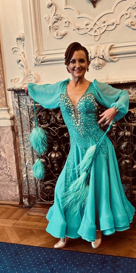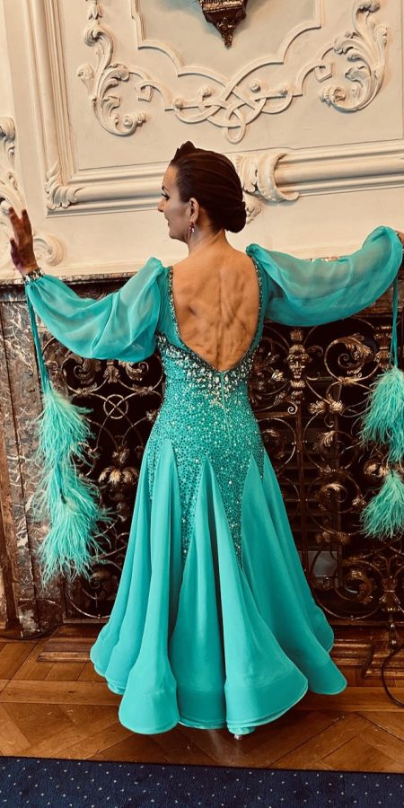 The dress is very elaborately trimmed, has a lot of Swarowski stones and swings beautifully.