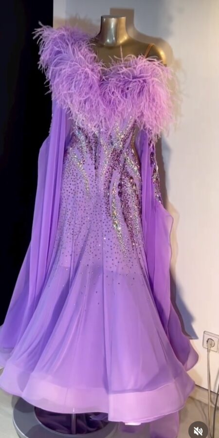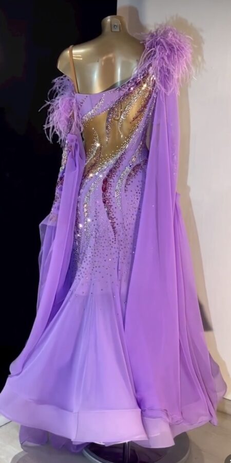Stunning Melnikoff’s Lilac gown with luxury 6 ply ostrich boa. Very comfortable to wear – loads of stretch so can fit size 8-12. Height suitable for 165-175cm. High quality crystals and trim in excellent condition. Comes with Melnikoff’s dress carry bag. Able to post internationally at buyers expense.